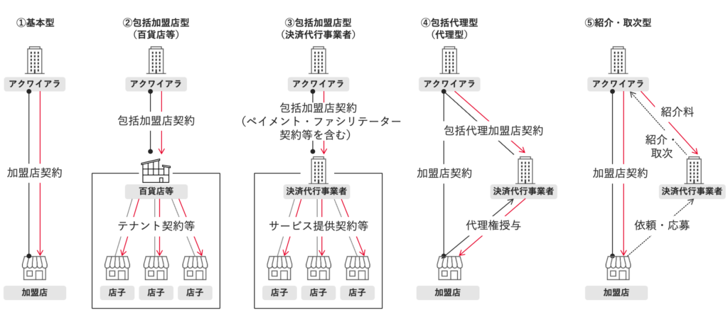 包括加盟店契約は、ショッピングセンターや百貨店等のデベロッパーだけでなく、決済代行事業者(PSP事業者)でも同様に包括加盟店契約を基としたサービス提供が行われています。